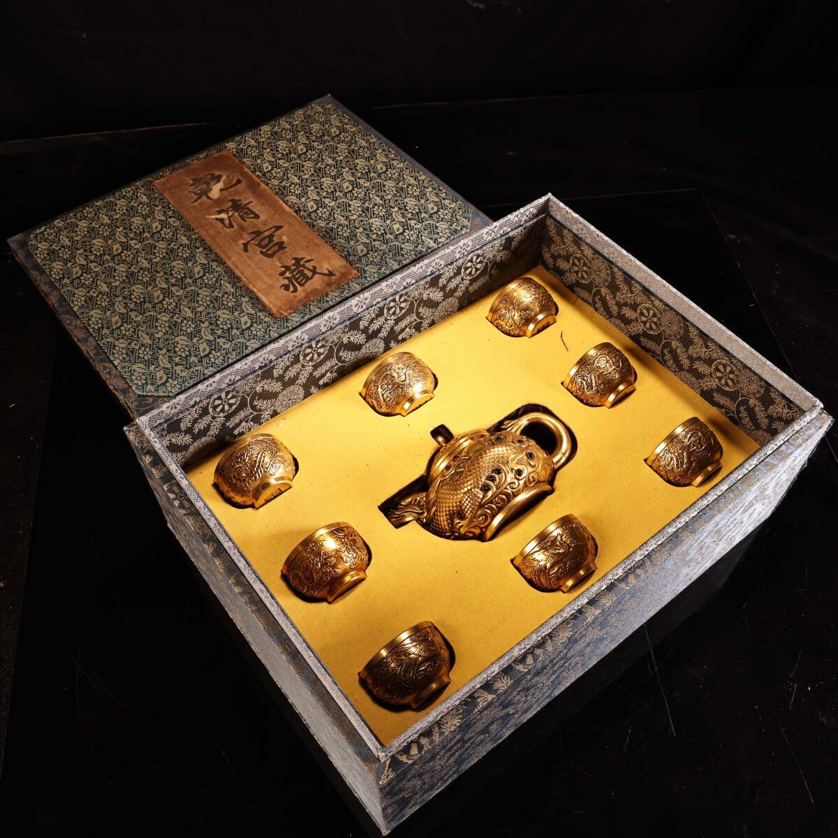- 「早期收集 乾清宮藏 古銅彫 宝石嵌 茶具一套 杯子 急須 龍紋 置物」時代物 古董品 骨董 旧家蔵出し 唐物 中国古玩 古美術品