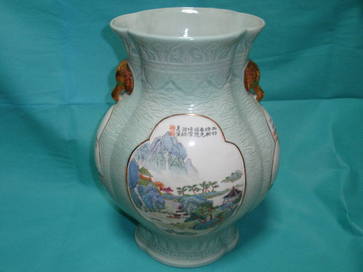 - 青磁 粉彩 山水図壺の複製品★花瓶★壺★