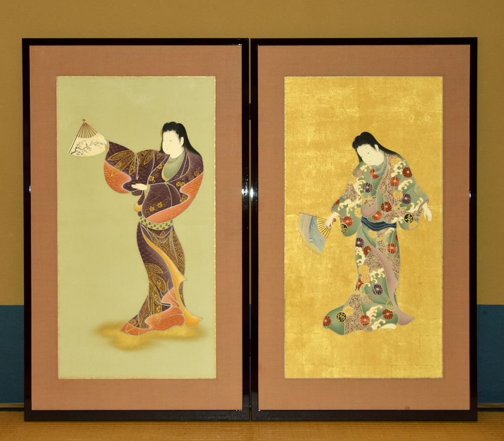 - 【複製】元禄 美人図 絹本着彩 二曲一双 屏風 人物図 金彩 横幅115㎝ 高さ97㎝ 日本画 人物 菩薩 工芸品 s-2060o