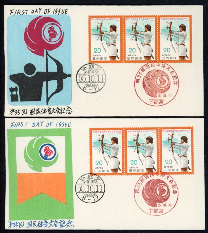 - 1184 【FDC】第35回国民体育大会 カシェ違い2種[宇都宮/55.10.1/松屋版]