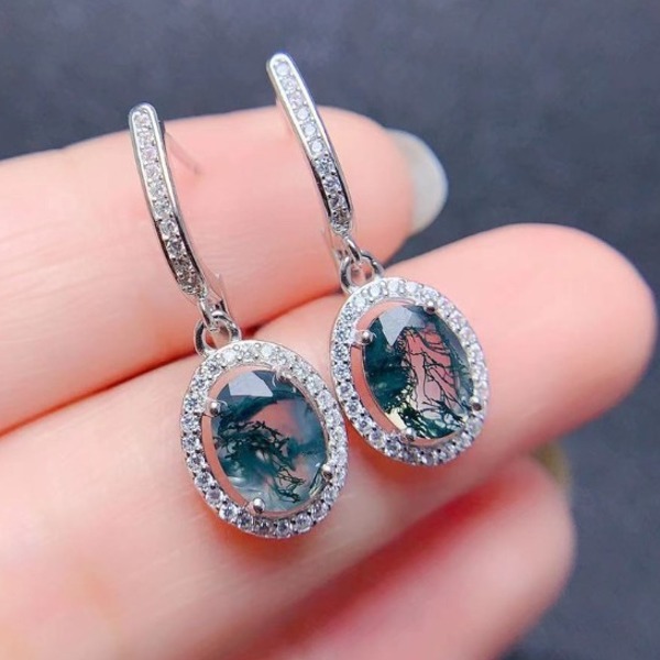 925スターリングシルバー 楕円形のモス瑪瑙ピアス、:8mm * 6mm 、天然クリスタル宝石、女性への婚約ギフト、高級ジュエリー