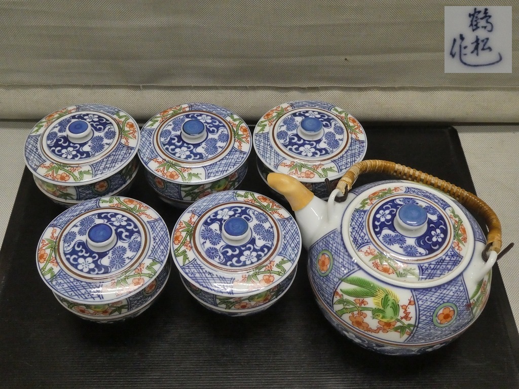 - ●有田焼 鶴松作 花鳥図 茶器揃え 5客セット 蓋付き汲出し湯呑 急須 和食器●