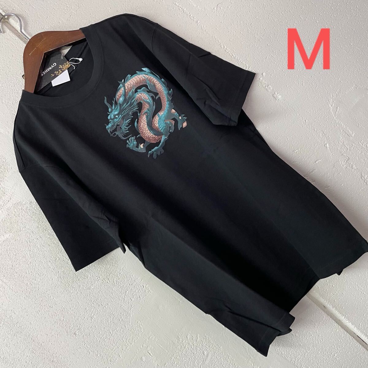 - Mサイズメンズ綿100%和柄プリント半袖Tシャツ黒龍