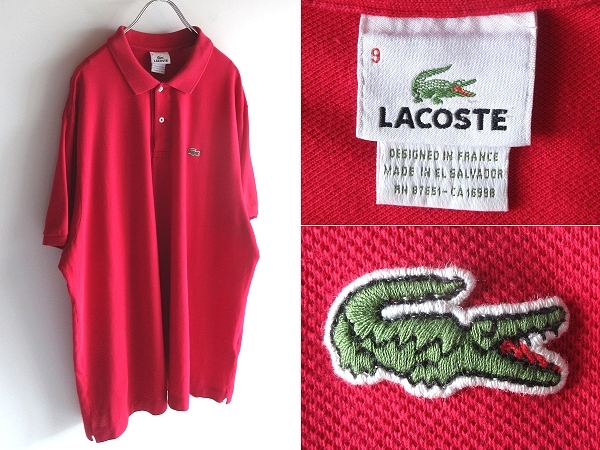 > 希少 90sビンテージ LACOSTE ラコステ DEVANLEY社 ワニロゴワッペン 鹿の子 ポロシャツ 9 レッド 赤 ビッグサイズ 特大 フランスデザイン