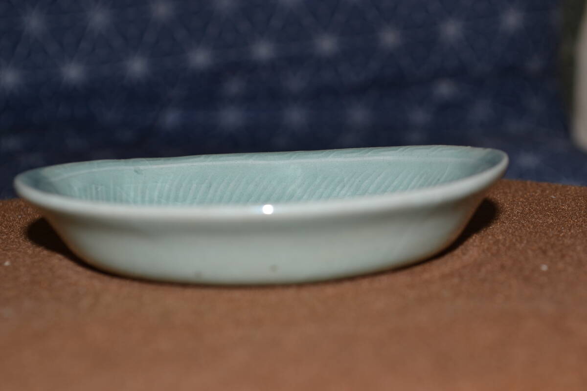 - 朝鮮陶磁 高麗青磁陽刻草花紋小皿 稀少 美しい発色 美品 逸品 ほぼ完品