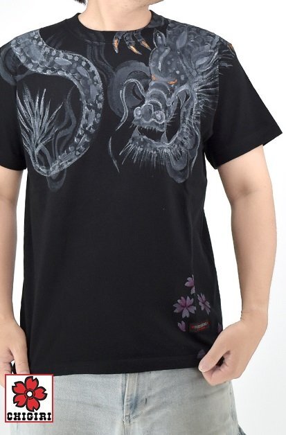 - ぬれ描き友禅 龍半袖Tシャツ◆CHIGIRI ブラック Lサイズ CHS63-651 チギリ ちぎり 和柄 和風 竜 手書き 職人 桜 さくら
