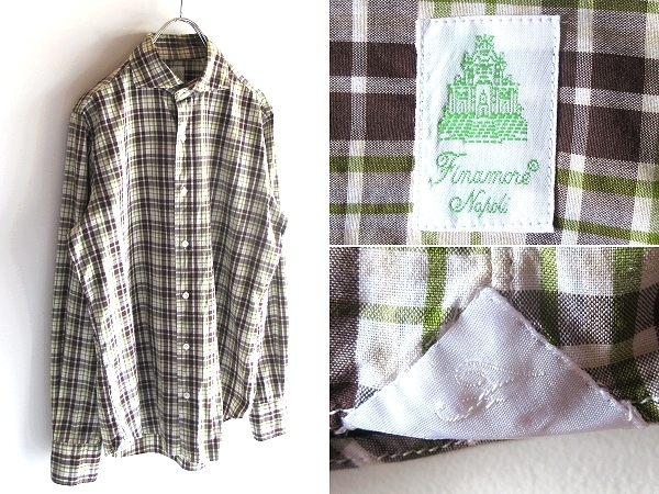 - イタリア製 Finamore フィナモレ チェックシャツ カッタウェイシャツ M ブラウン ベージュ グリーン BEAMS/ビームス購入 ネコポス対応