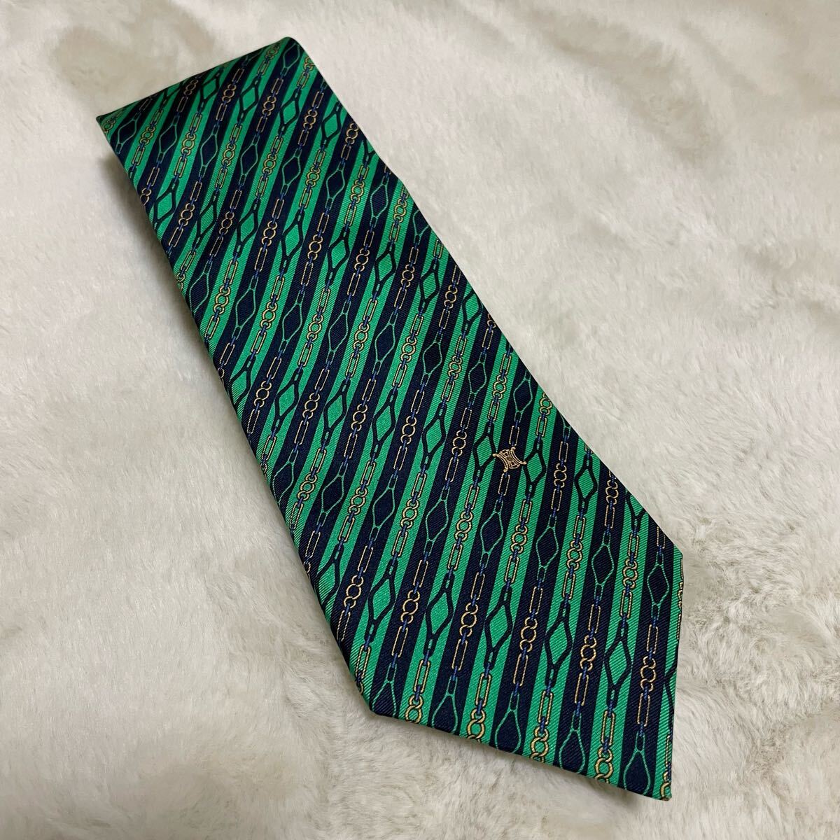 - 未使用品 CELINE セリーヌ トリオンフ シルク100 ネクタイ グリーン ネイビー系 総柄 ストライプ スペイン製 ビジネス メンズ