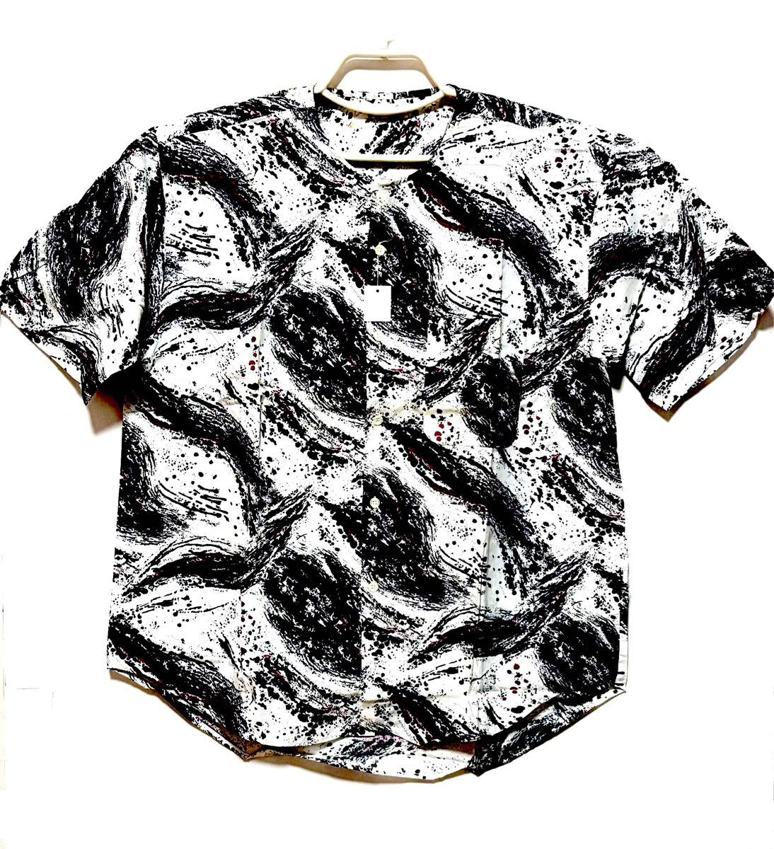 - 希少【新品】 半袖 襟無し ビックシャツ 胸ポケット 綿100% ホワイト/ブラック/レッド総柄 サイズF