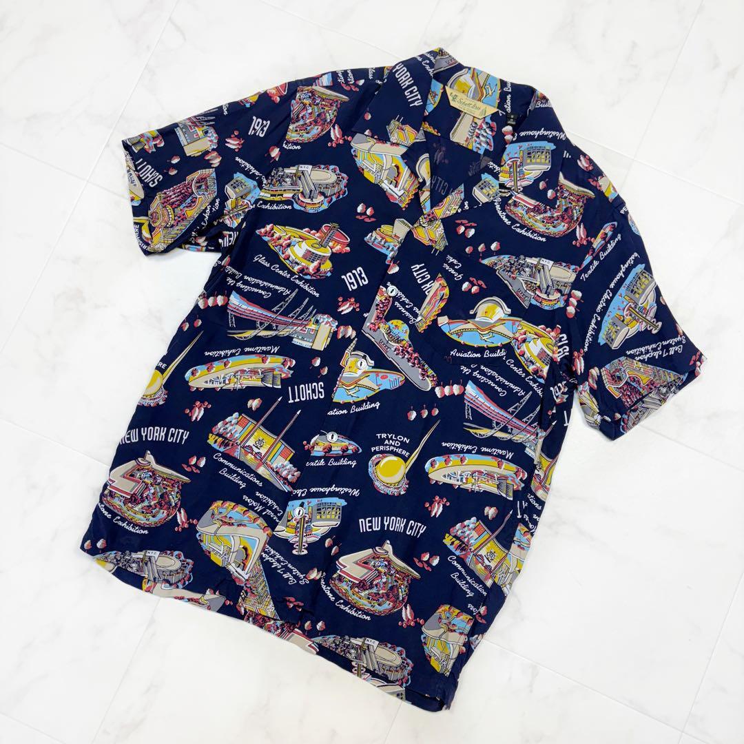 - ショット アロハシャツ NEWYORK CITY 紺色 S 開襟シャツ 日本製 Schott Bros. 1939年ニューヨーク万博モチーフ オープンカラー
