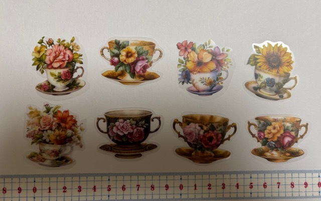 - ◆海外ステッカー シール 8枚【TB106】PET素材 ティーカップとお花 日記・ジャンクジャーナル・コラージュに