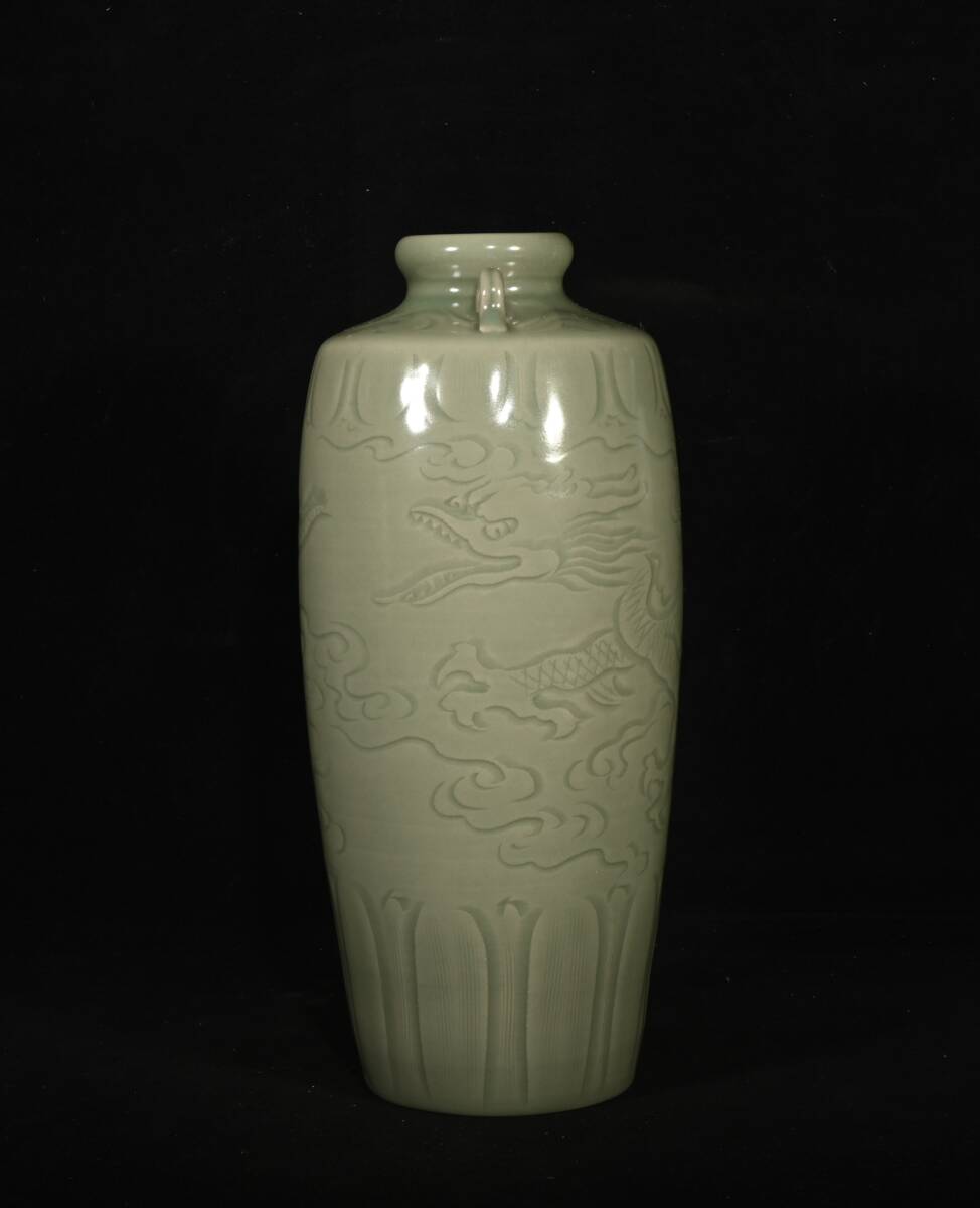 - 7+GV5003「東洋美術」 中国骨董 人間国宝 磁器製品【五代越窯秘釉龍文花瓶】 旧物 孤品 珍品 陶磁器 収蔵価値が高い