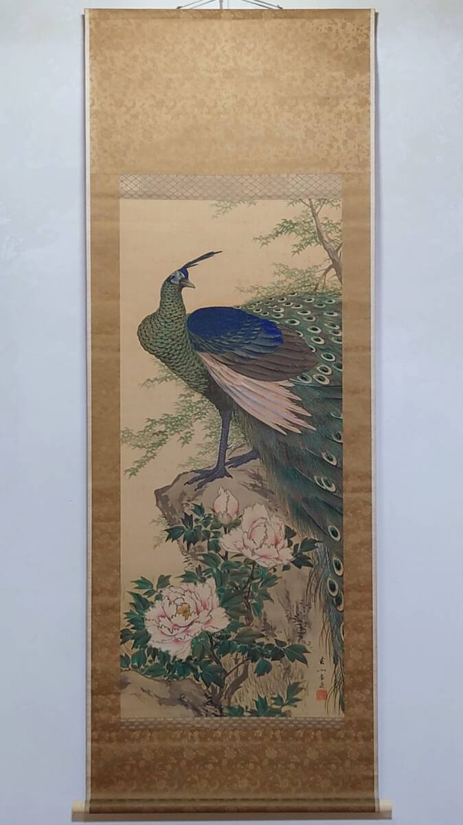 - ◆真作◆ 人気の石川県画壇 梶野玄山 画伯作品 : 岩上孔雀と牡丹之図 絹本 掛軸 ◆ 桐箱付き