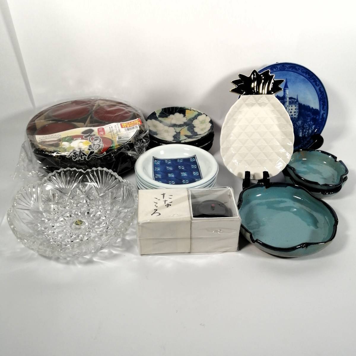 - 食器まとめ21個セット 猪口4個&竹すのこ付 小椀4個 小皿5個 メッキプレート ガラス皿 パイナップル皿 他【USED品】 22 00740