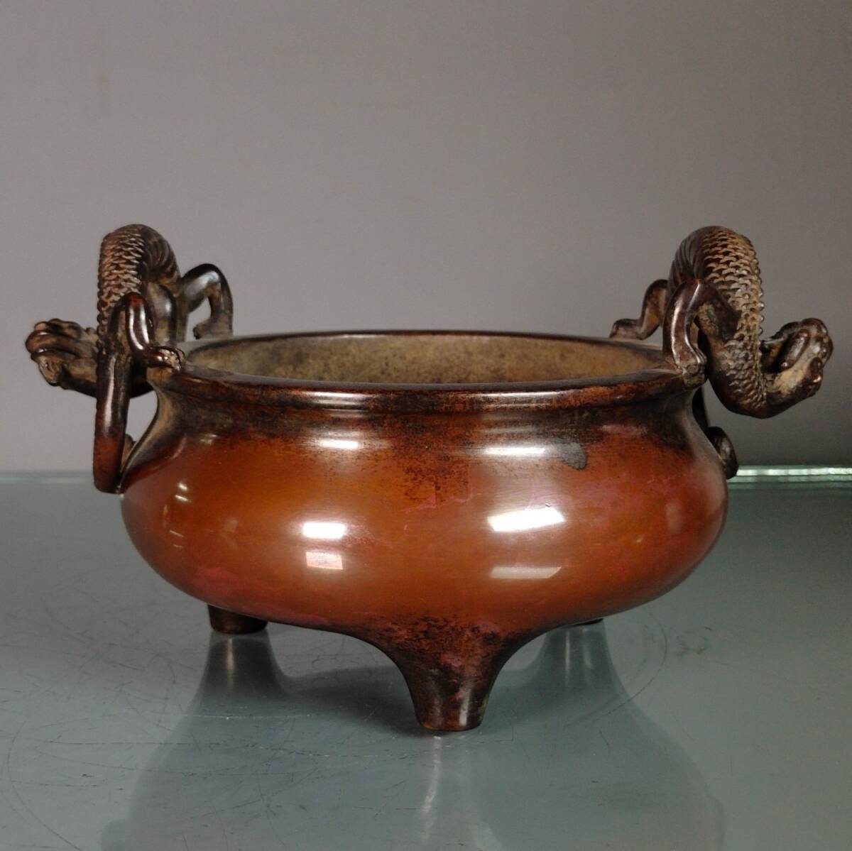 - 唐物 大明 宣德年制 紫銅 三脚双竜耳 香炉 置物 香道具 銅製 銅器 古美術品 時代物 中国古玩 骨董品 D67
