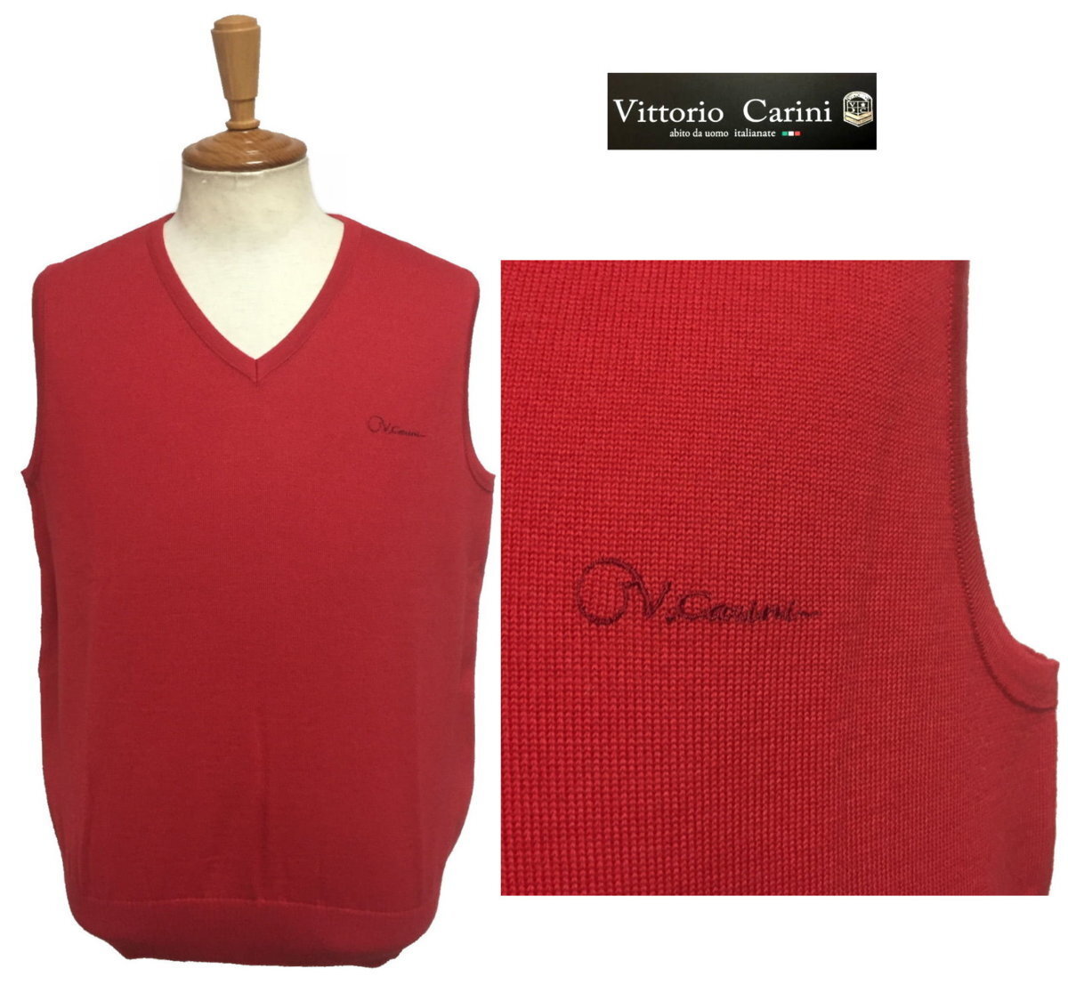 > 送料185円 Vittorio Carini ビットリオ カリーニ ワンポイント刺繍 ウール100% ニットベスト 赤 size46 Mサイズ 日本製