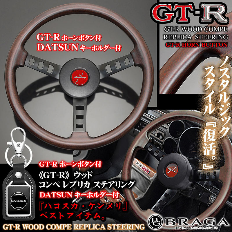 > GT-R/ケンメリ/スカイライン/天然ウッド コンペ レプリカ ステアリング【Rホーンボタン付/DATSUNキーホルダー付】旧車/絶版車ハンドル