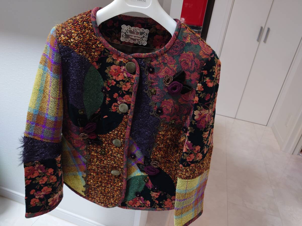 - ノンノンドールコレクション パッチワーク ノーカラージャケット フラワーモチーフ ビーズ 刺繍 38