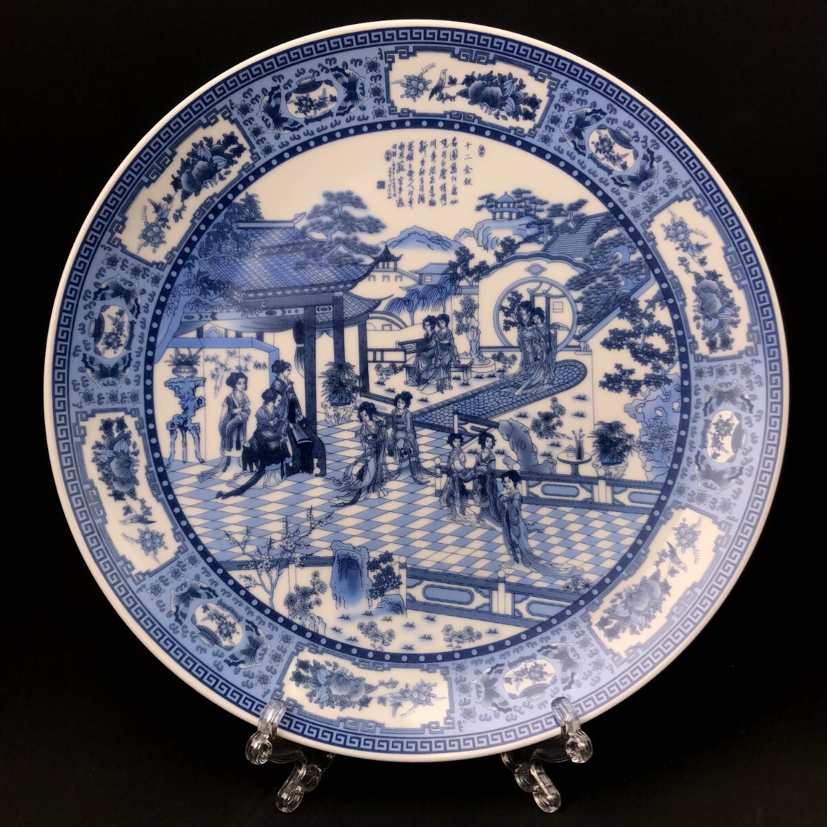 - 青花磁器飾皿 美人図 庭園仕女図 中国古美術風 唐物風 骨董調 中華装飾皿 美術陶瓷 飾り皿 大型皿