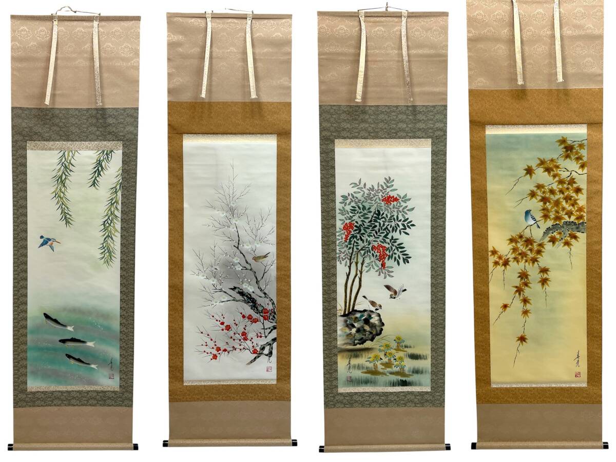 - 真作 春光 肉筆 掛軸 4点セット『柳に鮎』『紅白梅』『南天福寿』『紅葉』花鳥図 絹本 尺五立 春夏秋冬 季節 日本画 掛け軸 A