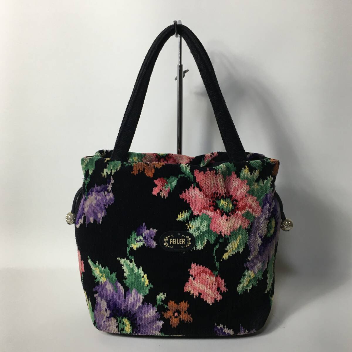 - 77B55|フェイラー ハンドバッグ シュニール織 ブラック 花柄刺繍
