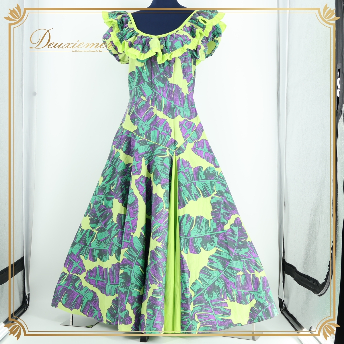 - フラダンス 衣装 グリーン系 ワンピース ドレス フラ ダンス メネフネプランテーション 緑 黄緑 紫 葉っぱ柄 ハワイアン フリル 日本製