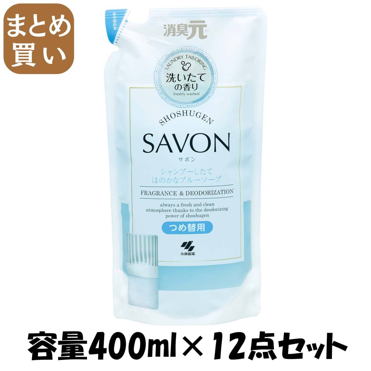 - 【まとめ買い】消臭元SAVON 洗濯したて詰替ふんわりブルーソープ 容量400ML×12点セット 小林製薬 芳香剤・部屋用