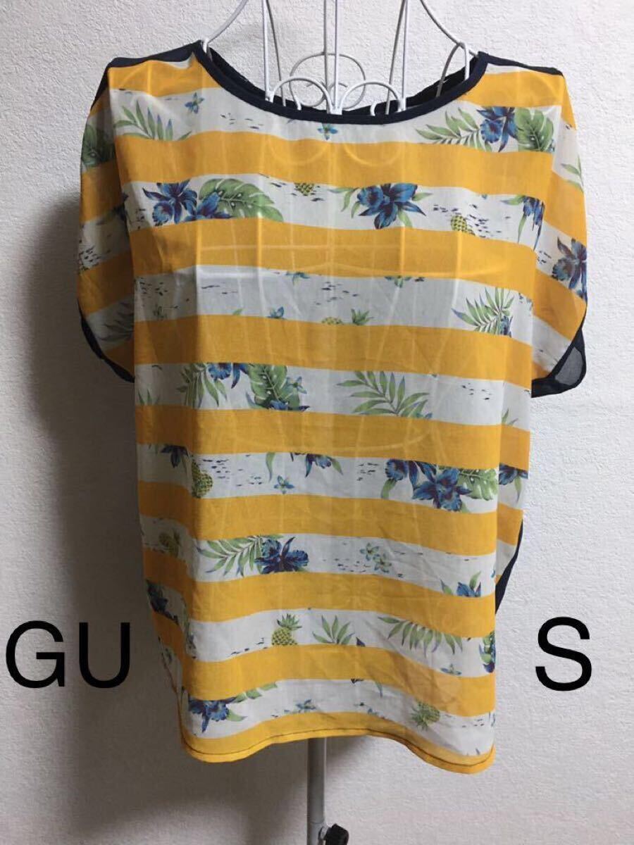 - GU ボタニカルリーフ柄シャツ シースルーシフォンブラウス ネイビー×イエロー