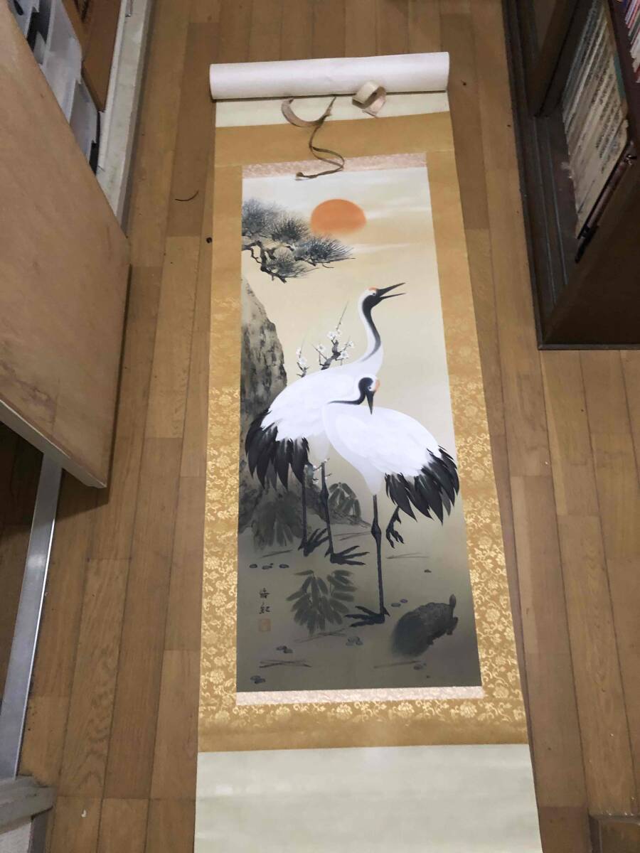 - 【掛軸・日本画家「宮野晧紅」・「松竹梅鶴之図」】山水に松竹梅・鶴の図柄 木箱付 日本画 古美術 茶掛け 書画 和モダン 床の間に