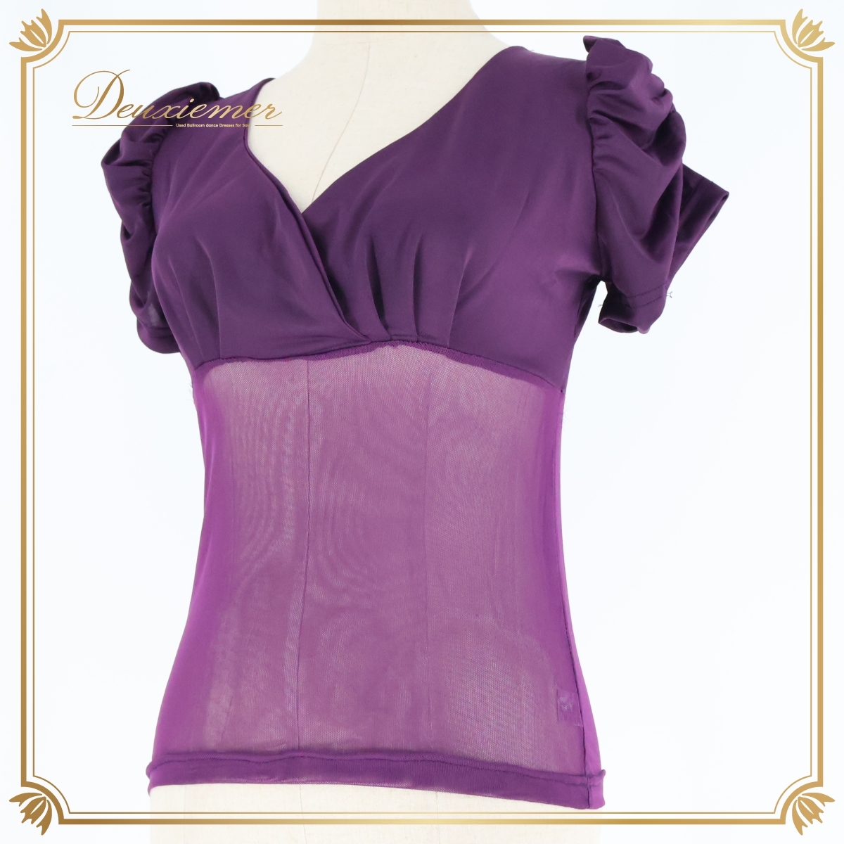 - 社交ダンス 衣装 トップス ブラウス 半袖 バレエ レッスン 練習着 紫 レース 透け感 パープル系 軽い 薄い パーティ 発表会 重ね着 綺麗