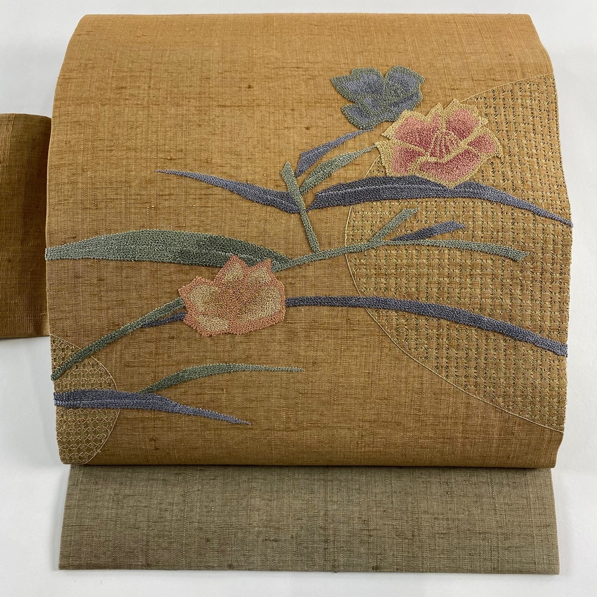 - 名古屋帯 秀品 紬地 草花 刺繍 薄茶色 正絹 【中古】