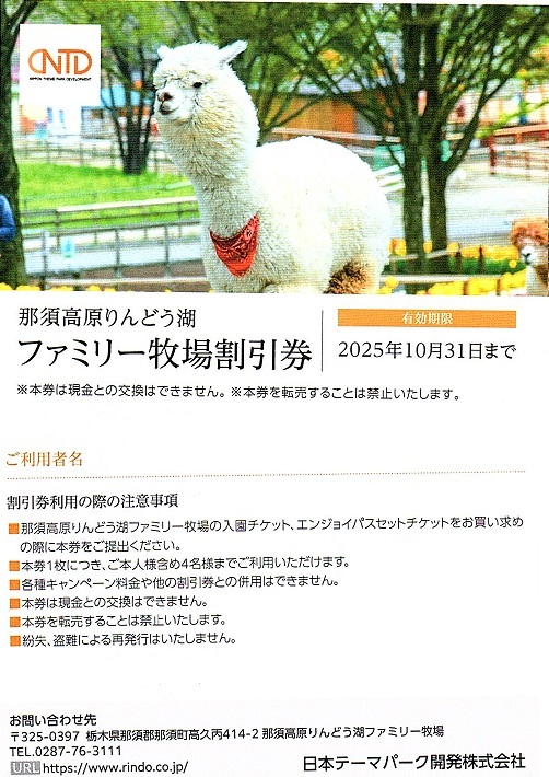 - 日本駐車場開発 株主優待券 那須高原りんどう湖ファミリー牧場 割引券 1枚 2025年10月末迄有効