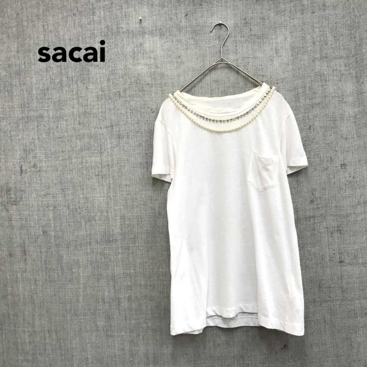 > 2S3492-D◆ sacai サカイ デザインカットソー Tシャツ シアー パール 装飾 ◆size2 ホワイト リネン ポリエステル
