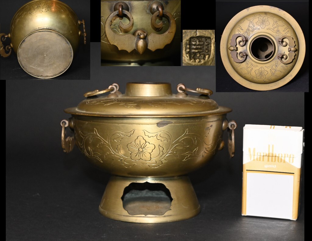 > 李王家美術工場造 神仙炉 蝙蝠手 シンソルロ 火鍋 宮廷料理 彫金 重量1266g 朝鮮美術 朝鮮美術工場 検:京城 海市商会 李朝