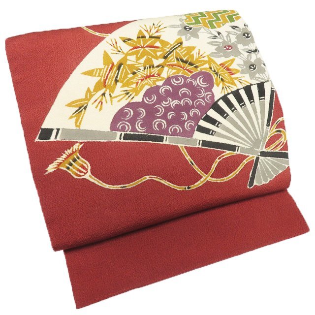 - 名古屋帯 なごや帯 中古 リサイクル 正絹 カジュアル 仕立て上がり 縮緬地 扇子に花の図 紅樺色 多色 きもの北條 A1251-11