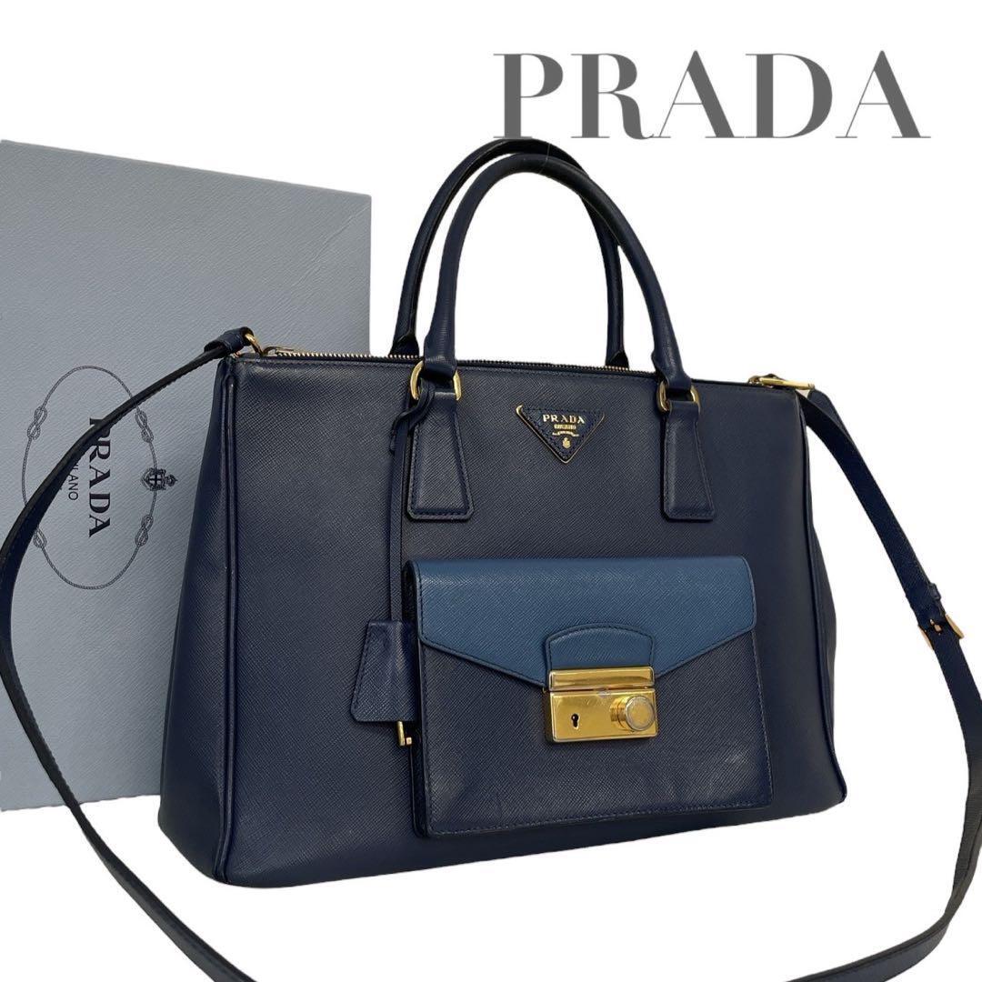 > 超希少 プラダ ハンドバッグ サフィアーノ 2way 三角ロゴ ブルー 4925
