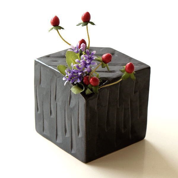 - 花器 陶器 おしゃれ 瀬戸焼 日本製 和風 花瓶 花びん フラワーベース 黒釉しのぎさいころ花入れ 送料無料(一部地域除く) mkn0848