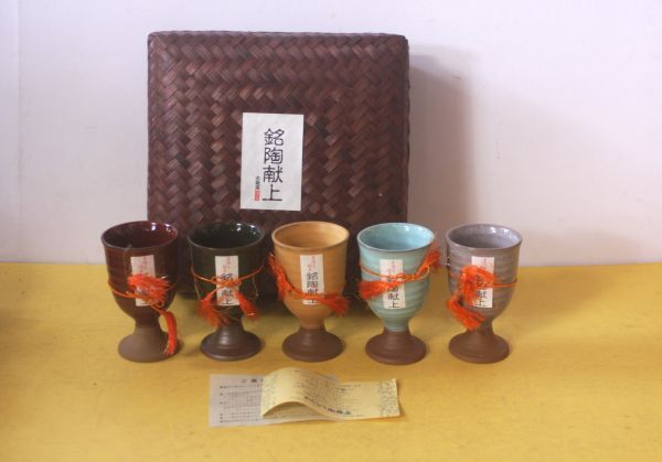 - 未使用品 美濃五彩 高台フリーカップ 5客セット 銘陶献上 志織窯 タンブラー 陶器 色違い/26N7.3-84