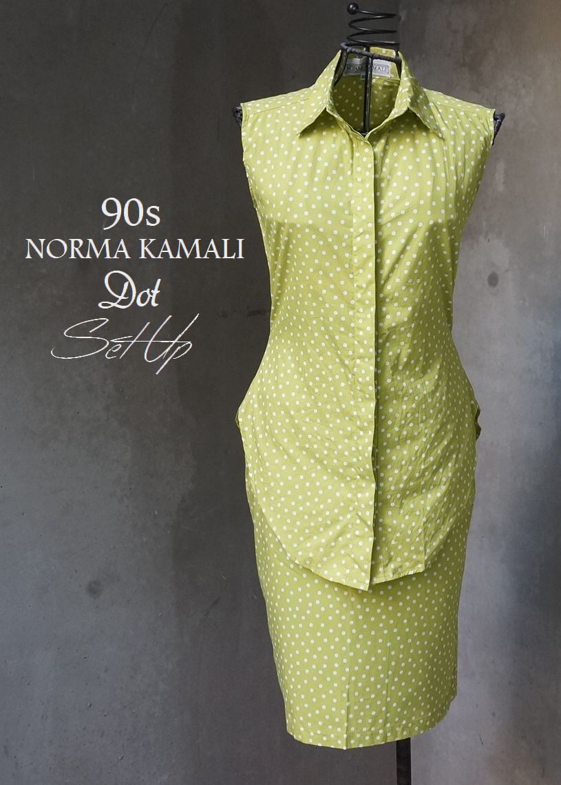 - 90s ノーマカマリ NORMA KAMALI 黄緑ドット コットン ノースリーブシャツ&膝丈スカート セットアップ M相当