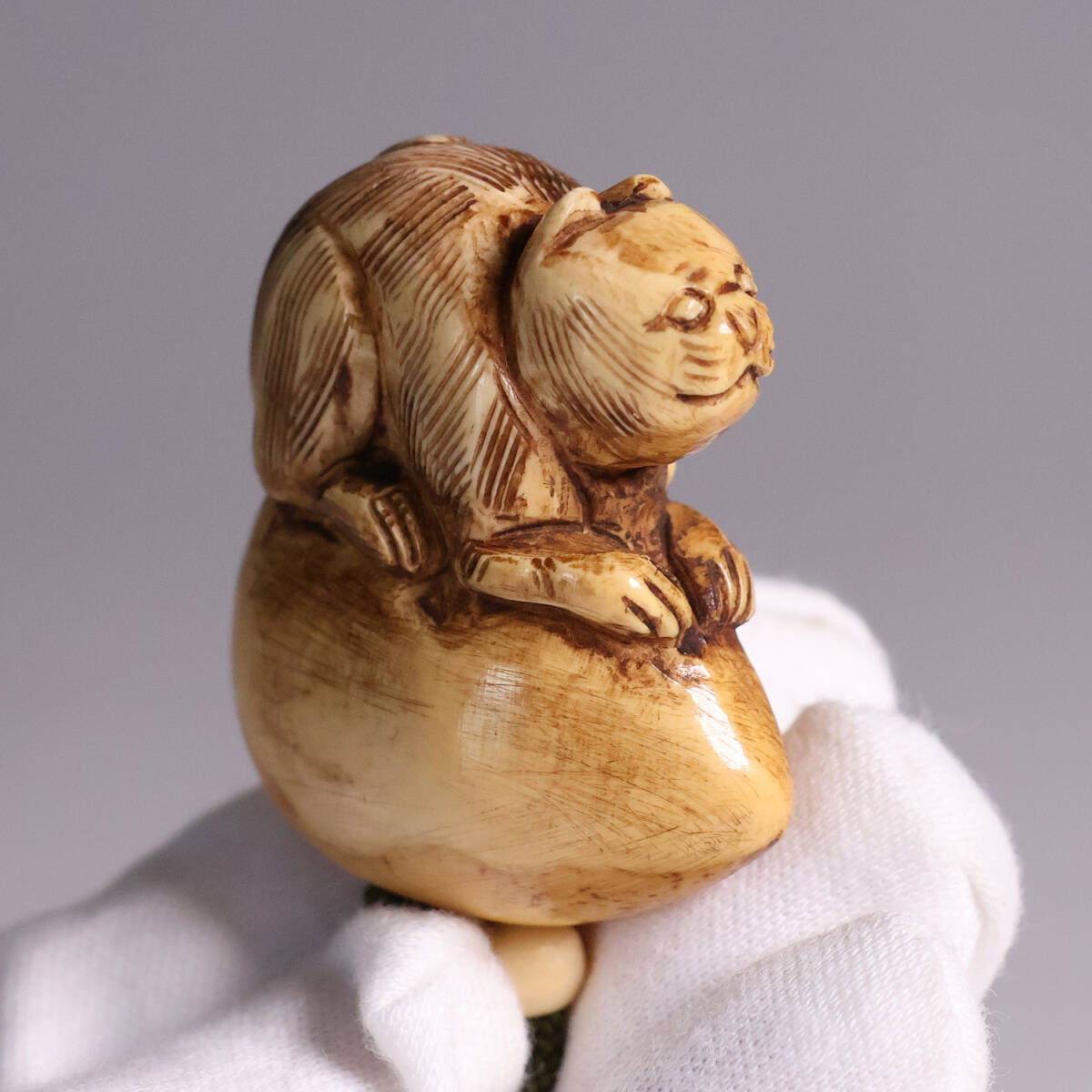 - 時代 堤物 根付 天然素材 猫 在銘 牙 骨 角 彫刻 提げ物 〇三 小川【CM264】