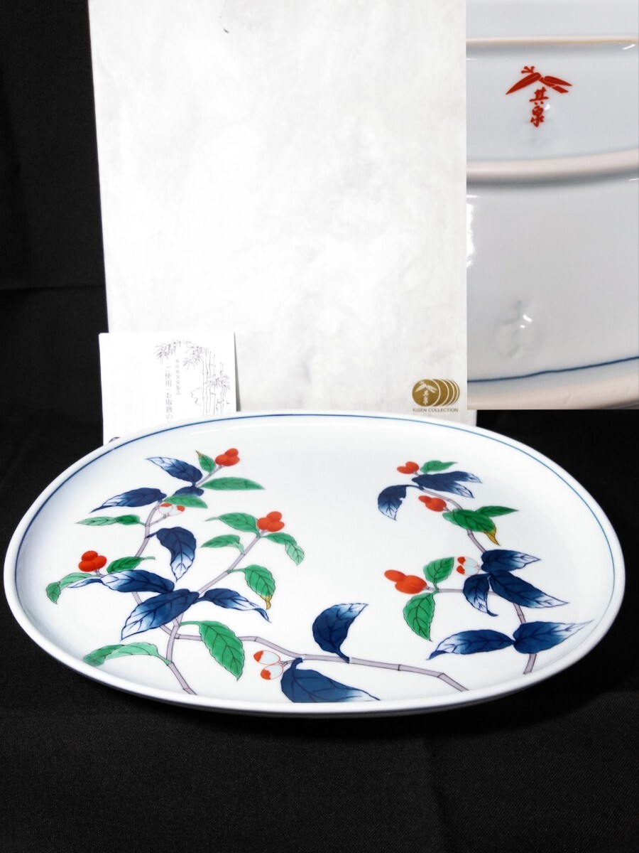 - 有田 賞美堂 其泉 染錦 楕円 盛皿 在印 KISEN プレート (検索) 工芸 美術 菓子皿 会席 懐石 絵付 アオキ 陶器 オーバル 大皿 レトロ 色絵
