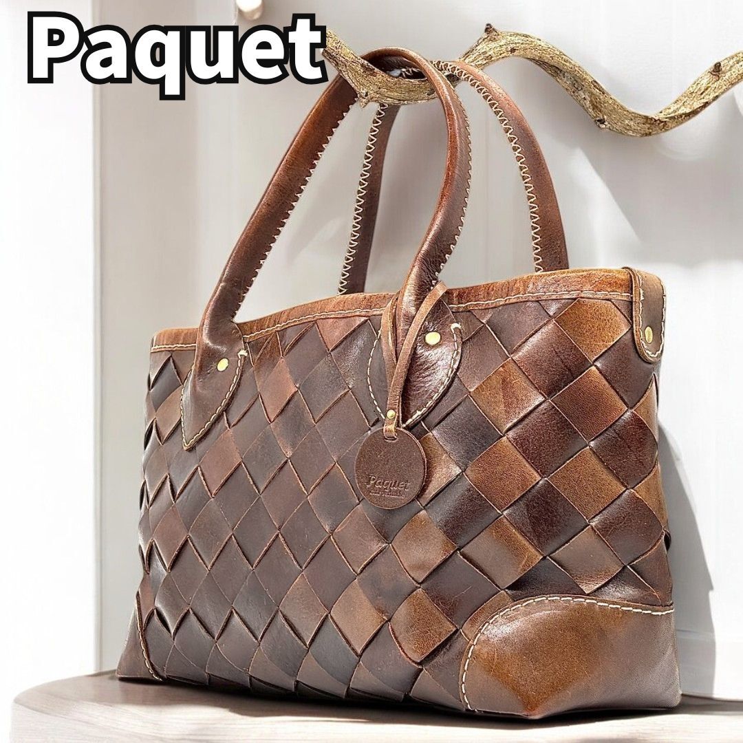 - Paquet パケ レザートートバッグ イントレチャート 大容量 編み込み ブラウン