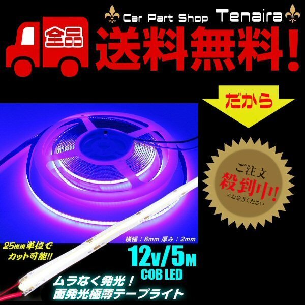 - 超光量! 12v COB 面発光 LED テープライト 5m巻き 極薄2mm 青 ブルー 色ムラなし カット使用可能 デイライト ゆうパケ 送料無料/6