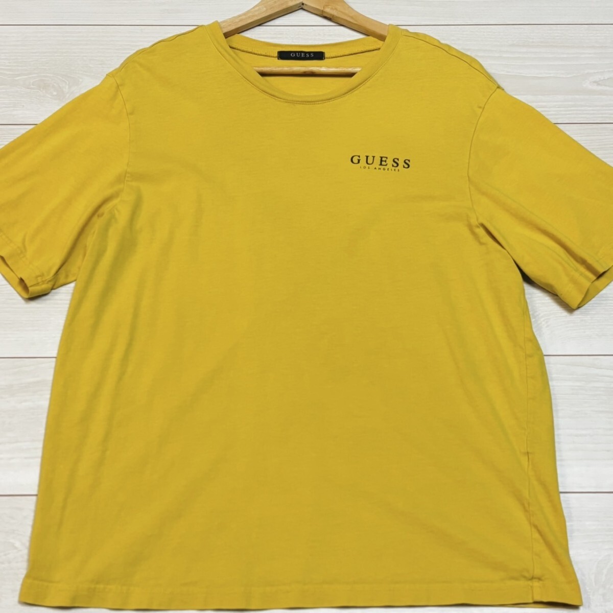 - 極美品/XLサイズ●GUESS ゲス 半袖Tシャツ 胸ロゴ 背面ビッグロゴプリント コットン100% マスタードカラー メンズ トップス