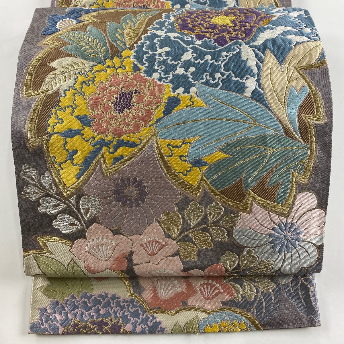 - 袋帯 美品 名品 草花 金銀糸 箔 灰紫 六通 正絹 【中古】
