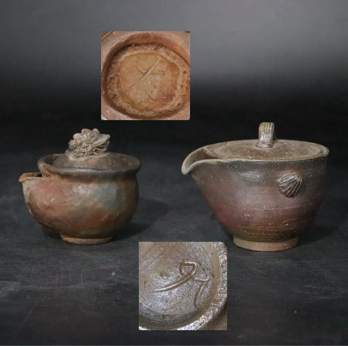 > 備前 龍 摘 ・ 変形 河豚 形 宝瓶 計2点 在銘 / 備前焼 煎茶道具 急須 細工物 .B882