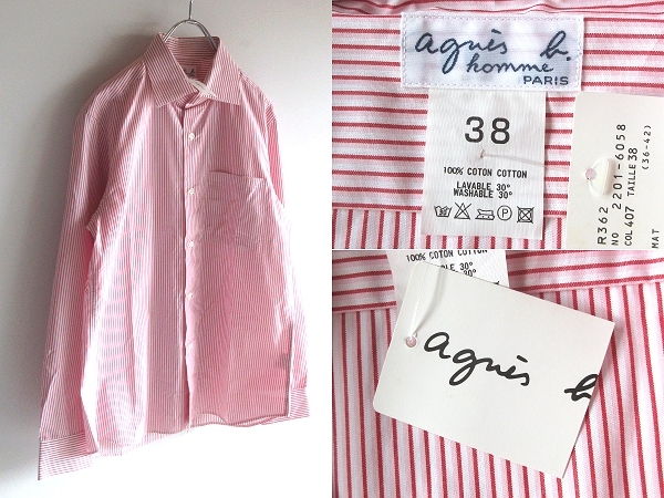 > 希少 タグ付 デッドストック ビンテージ agnes b. homme アニエスベー コットン ストライプシャツ ドレスシャツ 38 ピンク レッド ホワイト