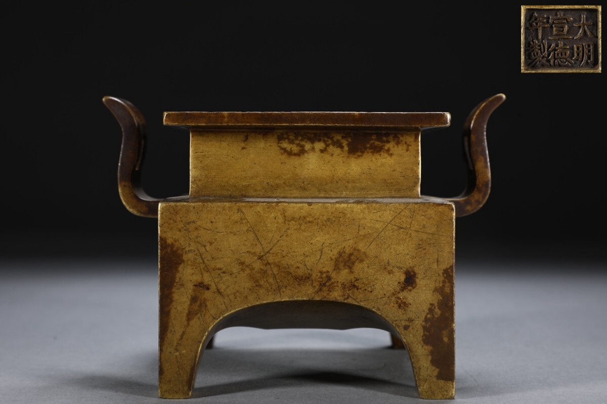 - 「明代 大明宣徳年製 古銅彫 朝冠耳老銅台几炉」旧銅器 置物擺件 賞物 中国古美術 旧蔵出