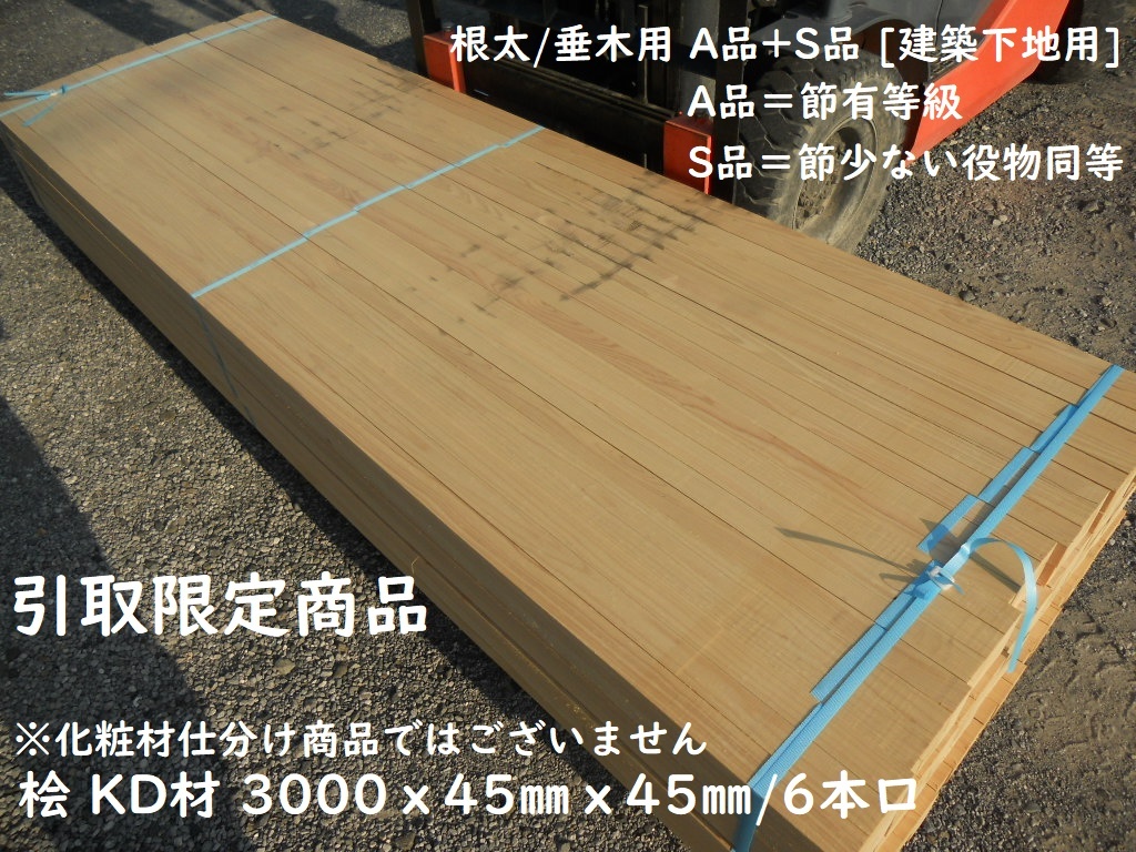 > 引取【6本/束】 桧 KD特等SA 3000x45x45mm 節有 簡易プレーナー 建築構造材 下地材料 根太 屋根 垂木 ヒノキ 檜 乾燥 木材 材木 DIY ひのき