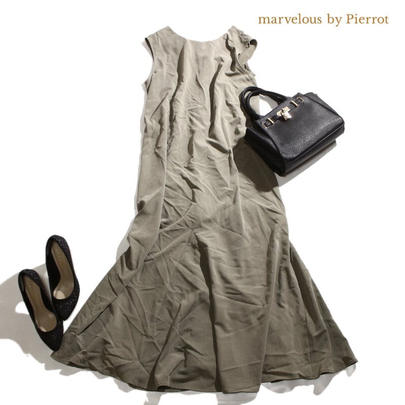 > 美品 marvelous by Pierrot マーベラス バイ ピエロ 夏 落ち感 とろみ レーヨン マキシワンピース ロングワンピース M カーキグリーン 緑